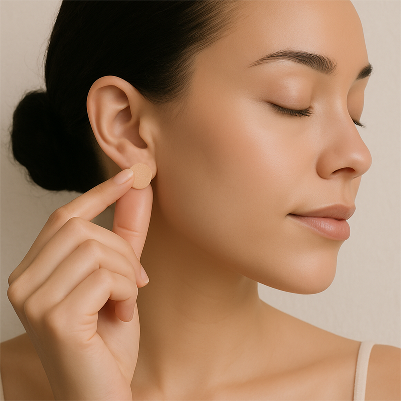 Place the discreet LobeLux patches on the front and back of your earlobe, aligning them comfortably over your piercing.